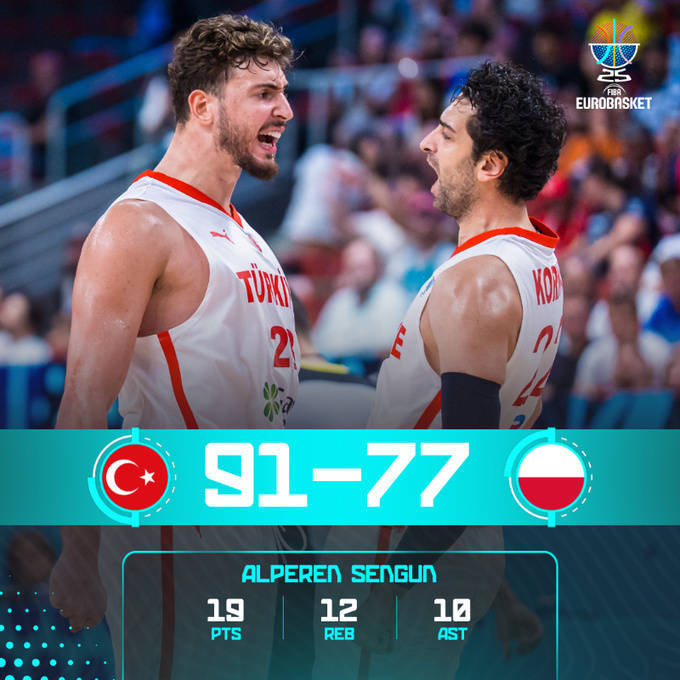 土耳其91-77击败波兰,时隔24年再次闯进欧洲杯四强。