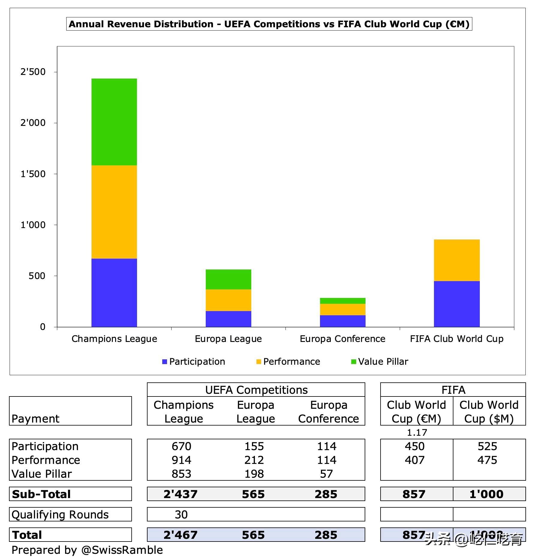 关于世俱杯是否有意义的话题或许可以画上句号,毕竟,真金白银才是球队最渴望的。根据SwissRamble的对比,虽然世俱杯的总奖金不及欧冠那样的天文数字,但也明显高于上赛季的欧联杯和欧协联的奖金总和。去年欧联杯和欧协联的总奖金为8.57亿欧元(约合10亿美元),尽管这一数字仅为欧冠24.67亿欧元奖金的34.74%,但仍远高于欧联杯5.65亿欧元和欧协联2.85亿欧元的总和。